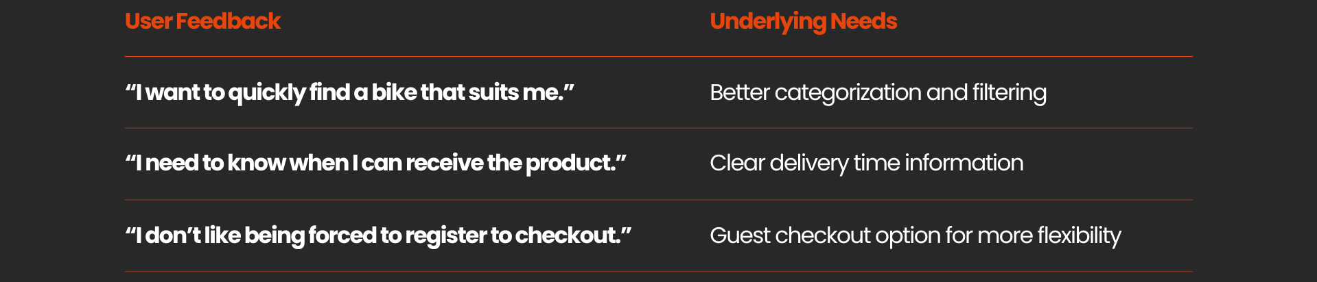 I interviewed several target consumers who had experience purchasing bicycles online to better understand their needs, pain points, and motivations. Here are some key takeaways: