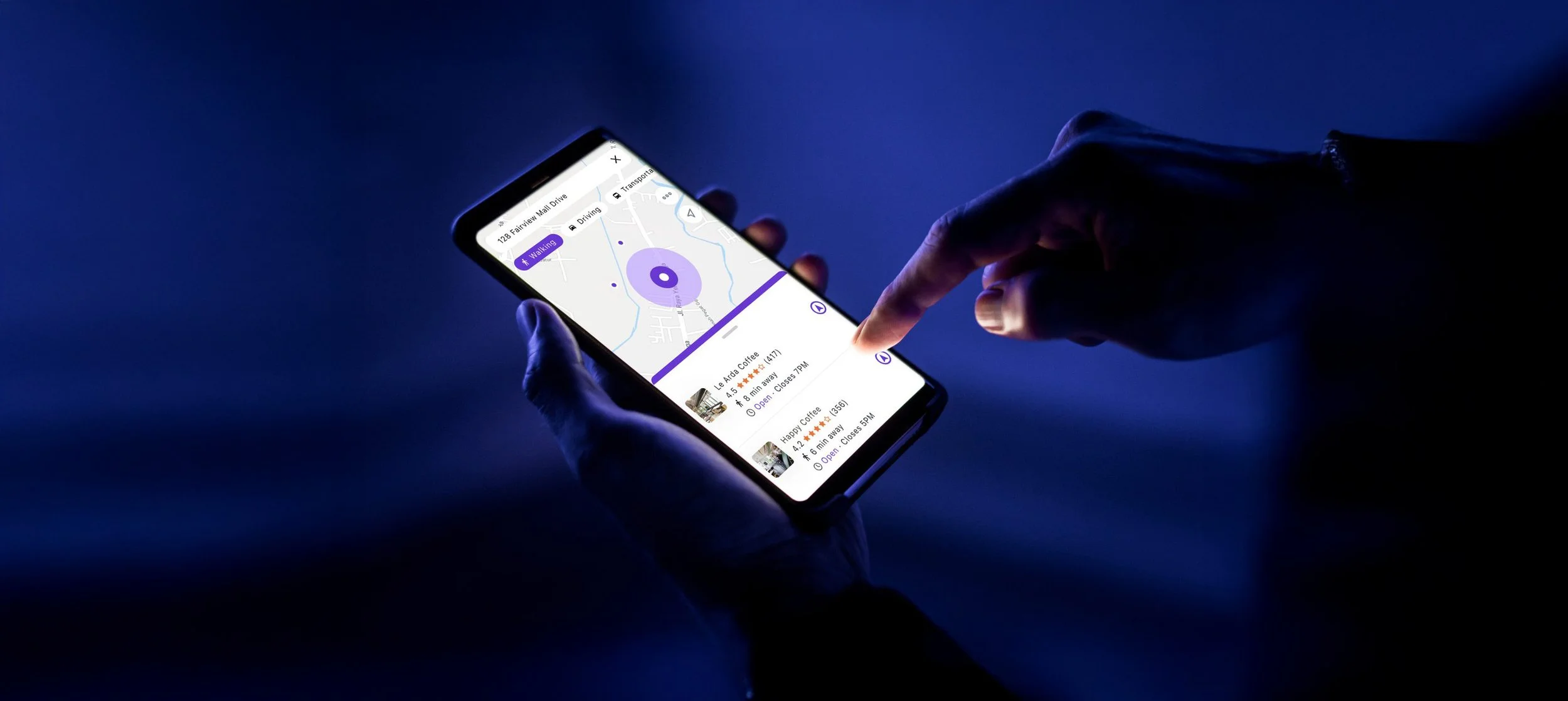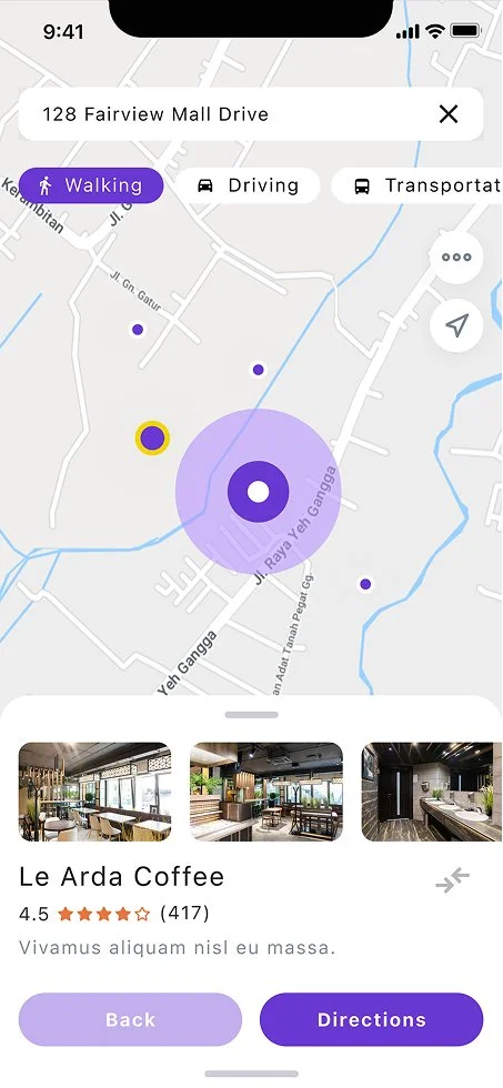 After finishing her morning meeting, Rita has an hour to get some writing done. She opens PostUp, which lands directly on the map. She selects “Walking” mode and enters her current location.